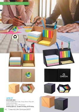 ECO FRIENDLY PRODUCTS APB 07 ECO CUBE BOX Customizable ECO Cube Sticky Memo Pad with Satationery Holder Product Size : 240 x 177x 37 mm Printing Options : Screen Printing, UV Printing 44 | Corporate Gifts Catalogue 2025 |